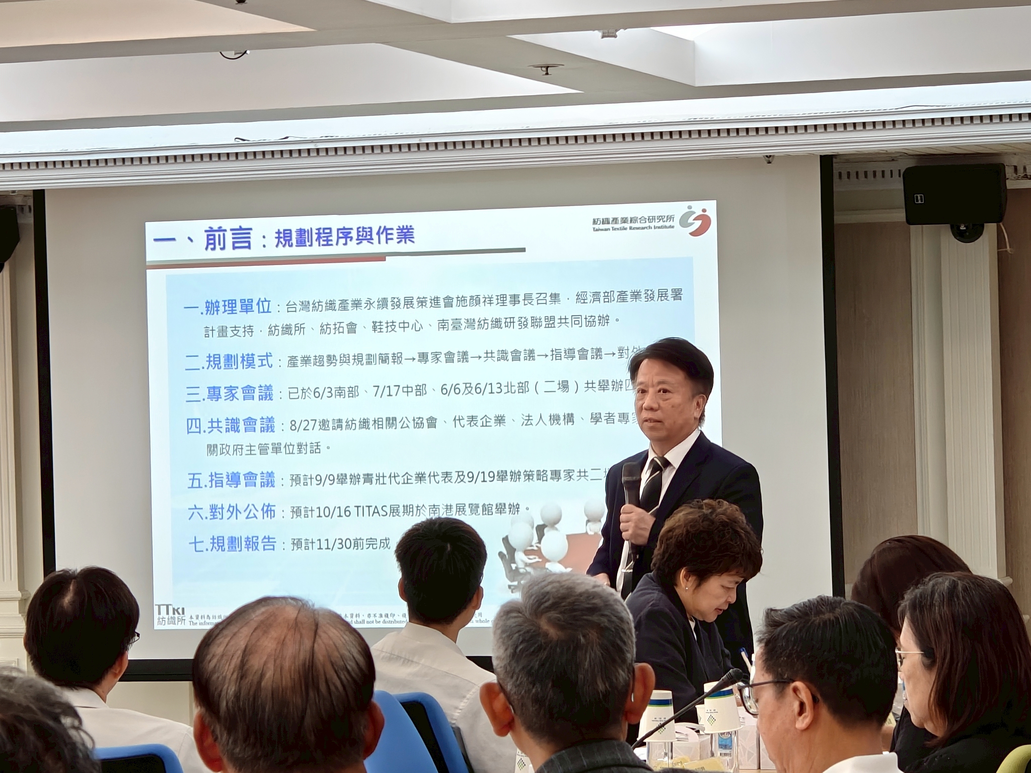 經濟部十分關切產業因應調適,故自今年6月起,特別邀集於南、中、北區產業專家, 群策群力共同擘劃『2035高值永續紡織產業願景與策略』,會議中專家們一致認為面對永 續轉型的巨大挑戰,企業無法單打獨鬥,必須透過系統性的、整合性的、跨產業的合作, 才能真正實現台灣紡織產業的永續發展;而專注於高價值與客製化特性的利基產品,不僅 能避開成本競爭,更能在地緣政治重塑供應鏈時,滿⾜全球各地區對供應鏈韌性和產品需 求。本次會議依據產業專家建言,提出『2035高值永續紡織產業願景與策略』初版,邀集 產、官、學、研進行討論,凝聚後續推動共識,期盼維繫臺灣紡織產業持續扮演國際供應 鏈關鍵地位與競爭力。